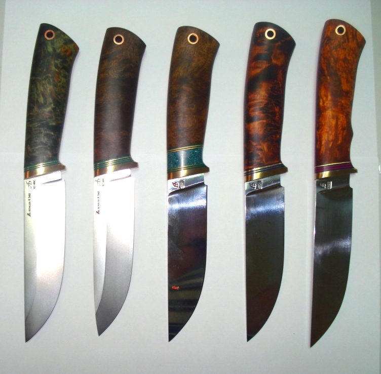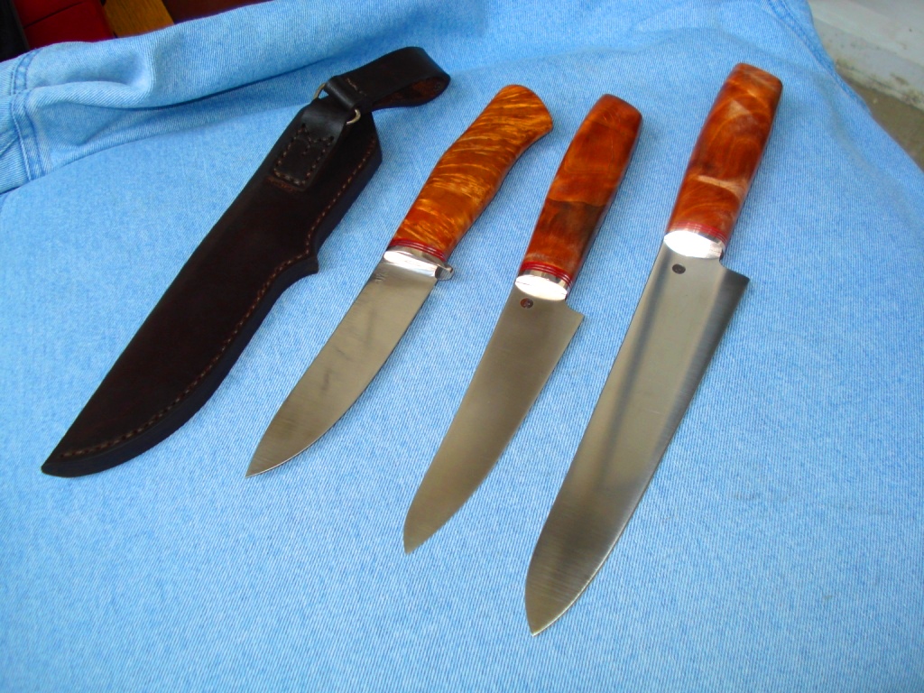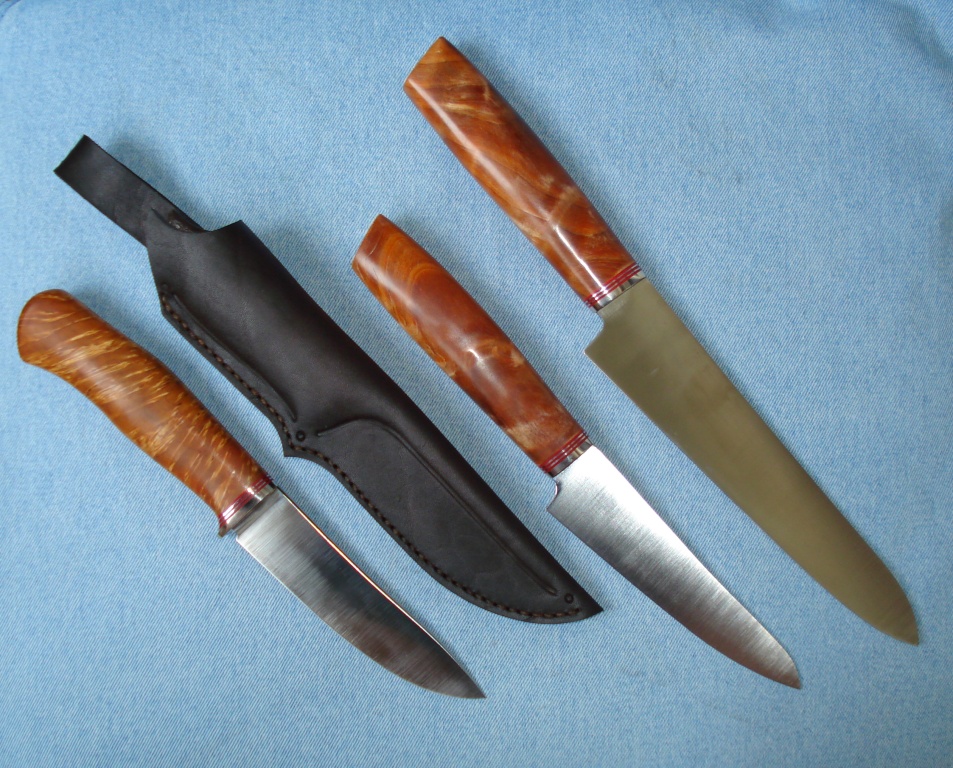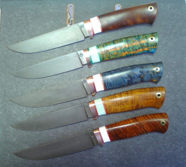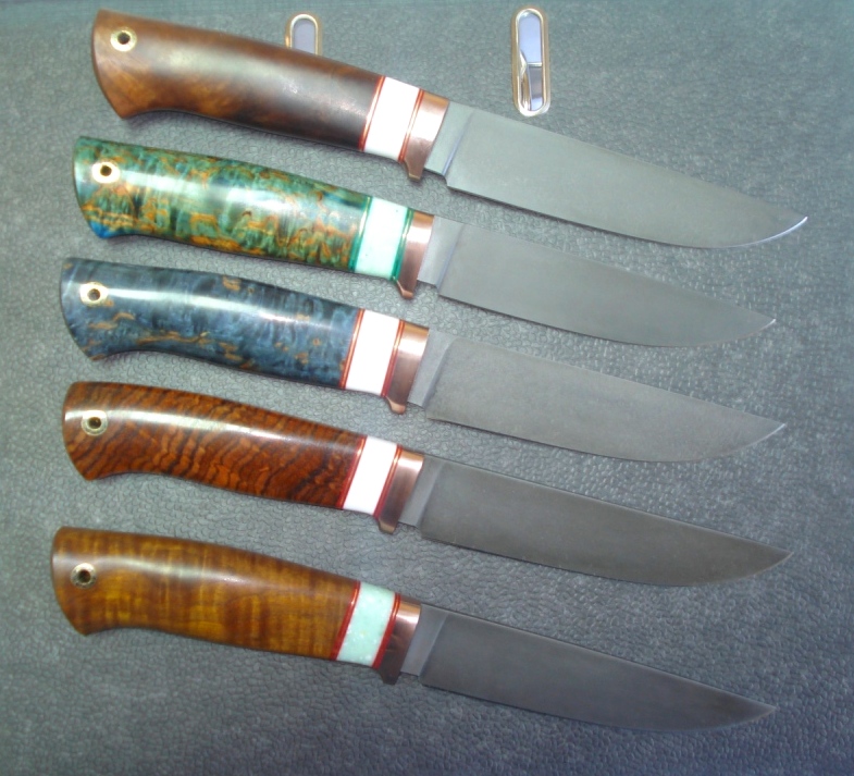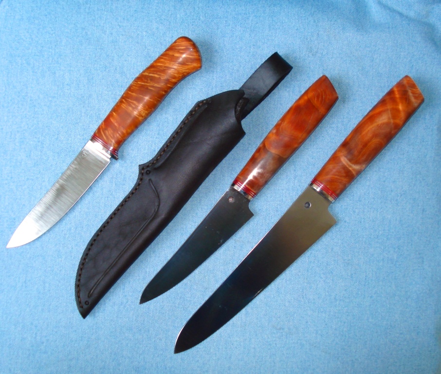 Сделал вот хорошему человеку комплект. Сам он охотник поэтому ему скинер, что б он добытую дичь в лесу разделал, а его супруге пару кухонников - произвести добытое в прекрасные блюда.