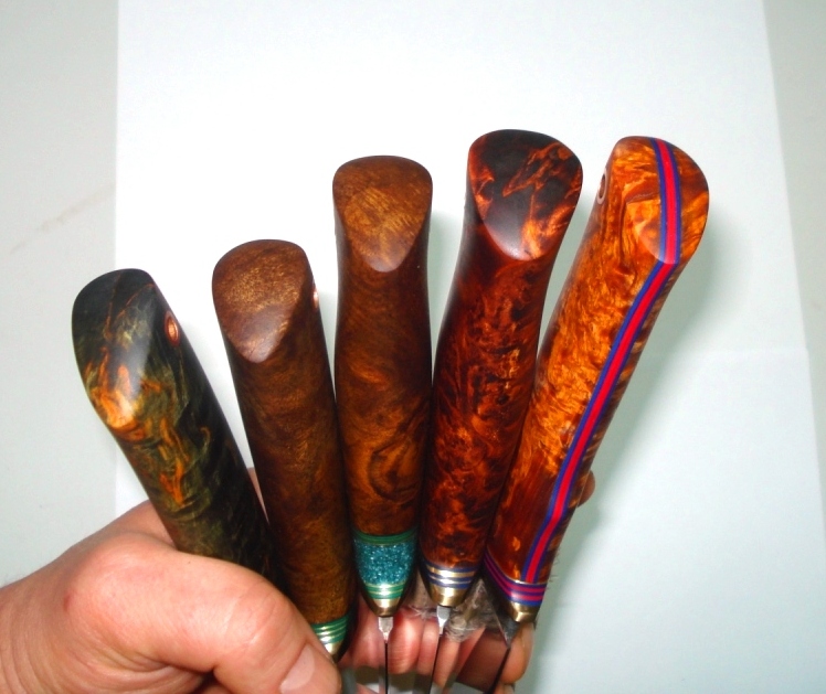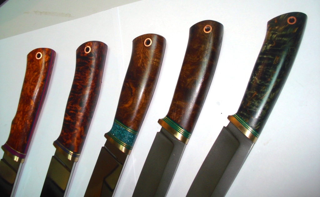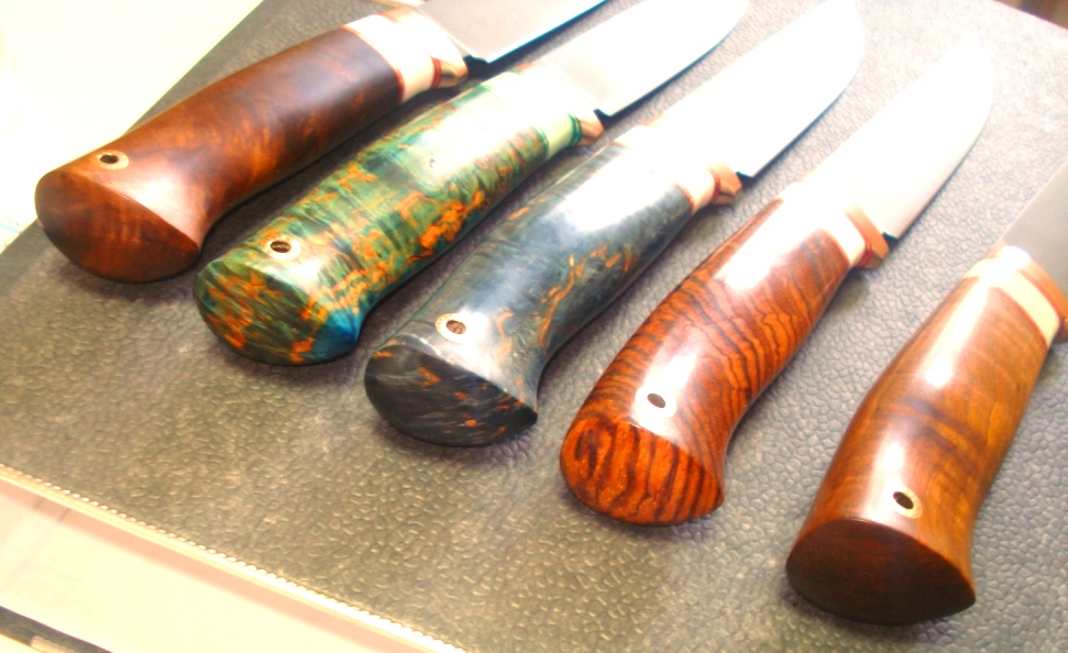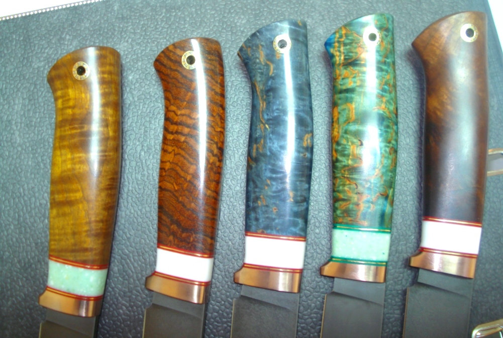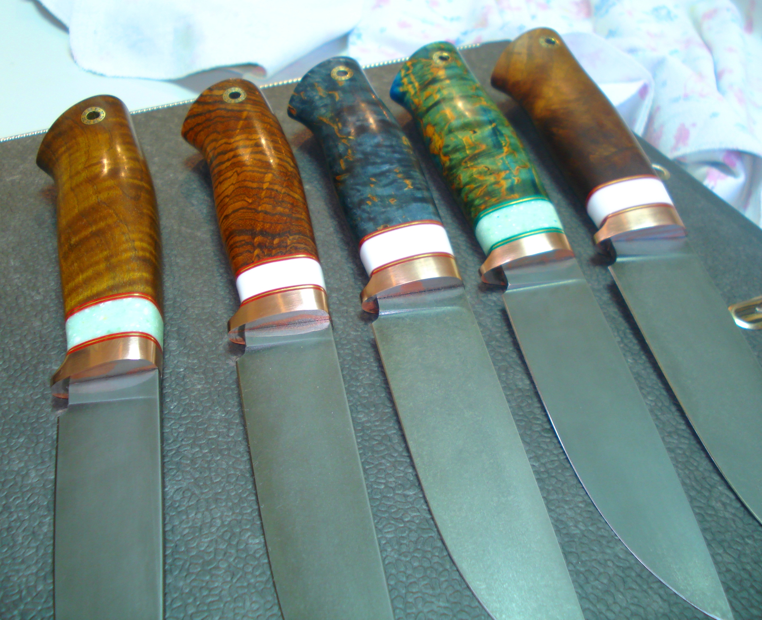 На рукоятях стабилка, зебрано, и сувель какая то фруктовая. Все около 120 мм. Мокумка, пин, кореан, фибра, латунь.