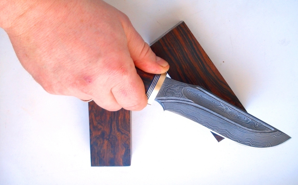 Принес Гендос мне клинок! Скажем так - своеобразный. Я даже растерялся сначала. Посоветовался я с коллегами - подсказали - и вот что получилось. Генка сам еще не видел - выкладываю продукт впервые. Ну будет сюрптриз к празднику. Деревяшка - Аризонское железное дерево, клинок - дамаск от Назарова