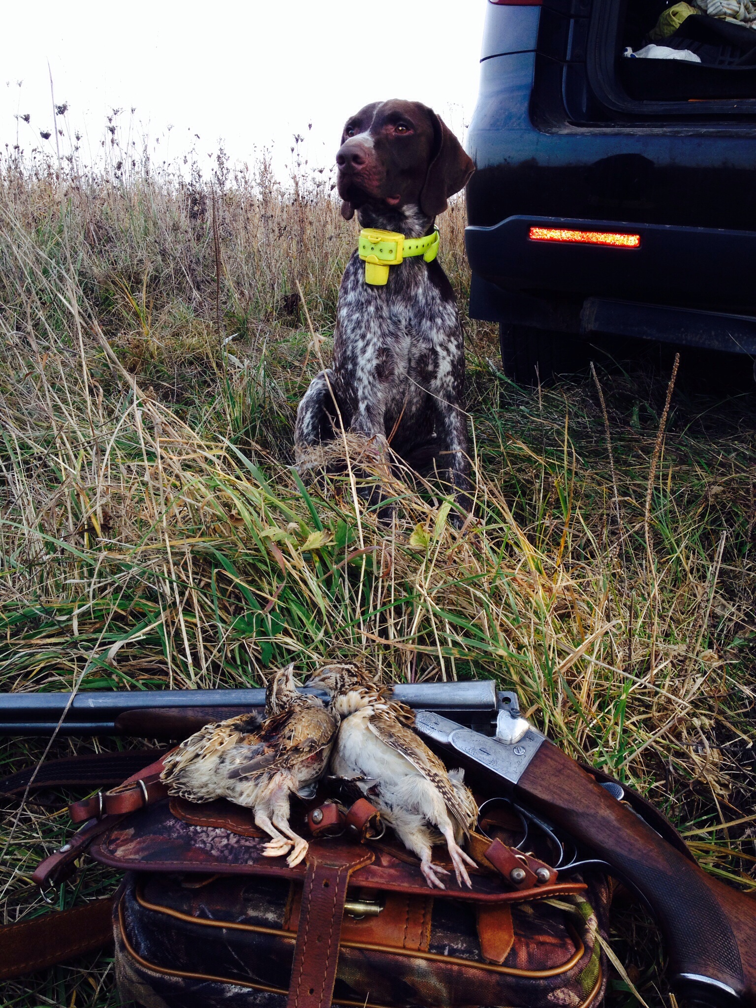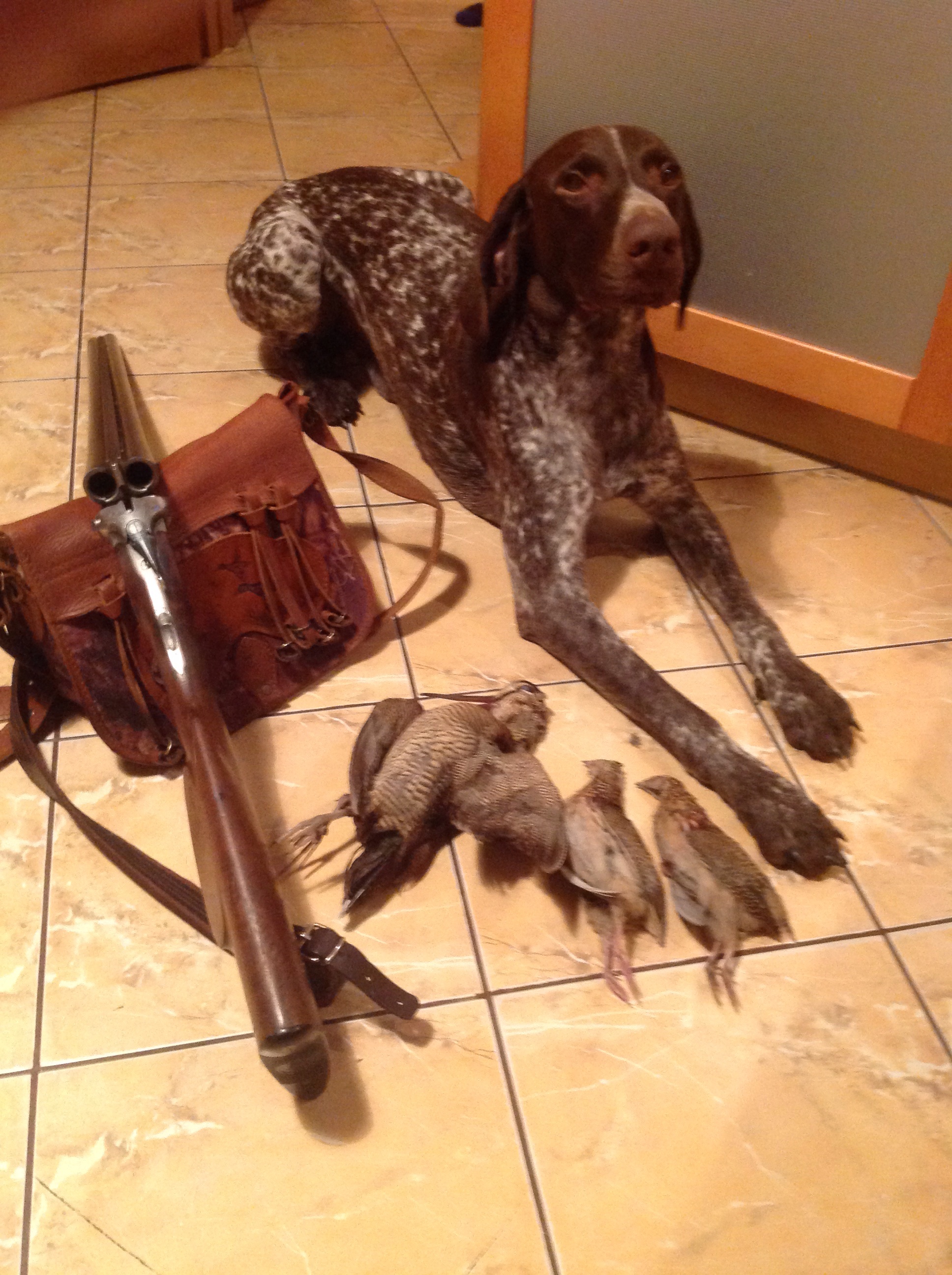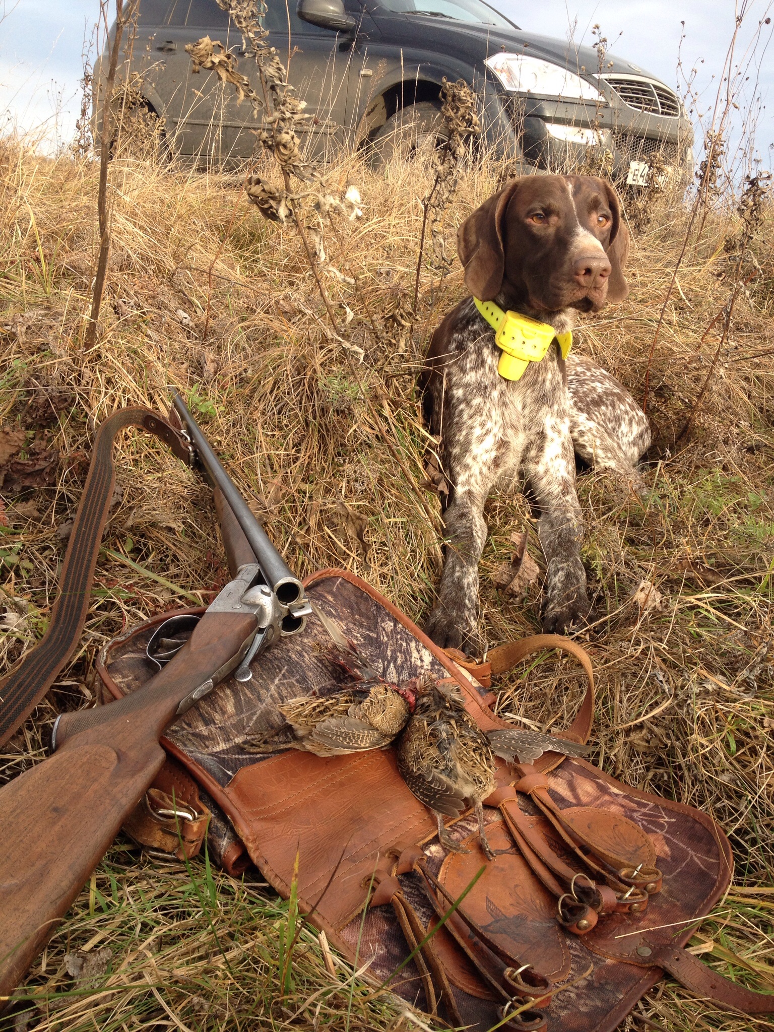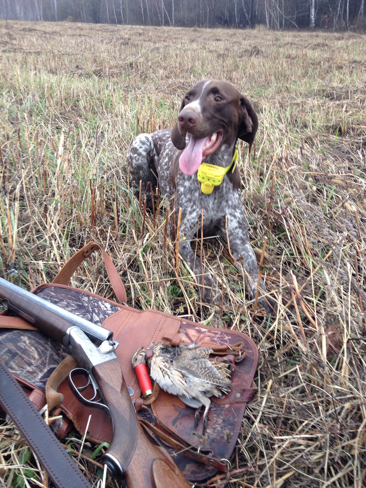 Идем... Стойка... Посыл, выстрел.... Перепел падает с пробитым крылом, пытается убежать, команда Эду - взять!... Со второго прыжка Эдик его берет- есть начало!