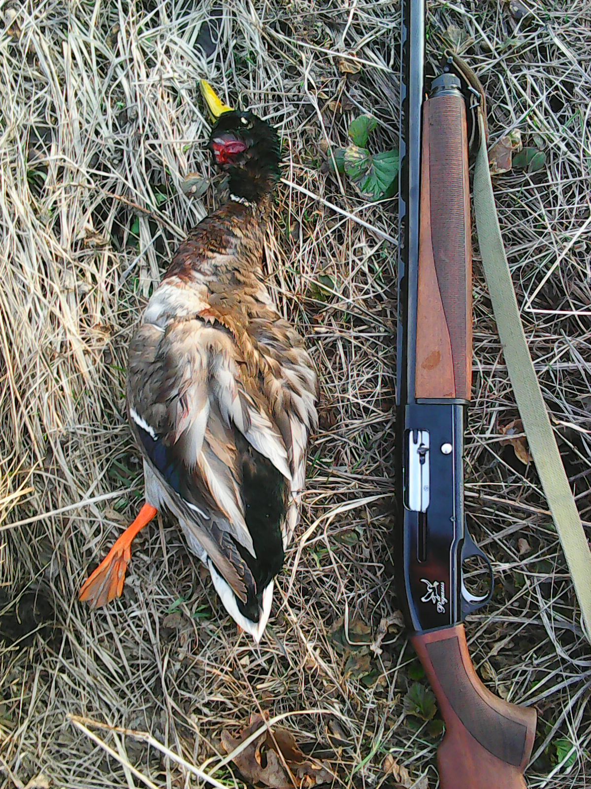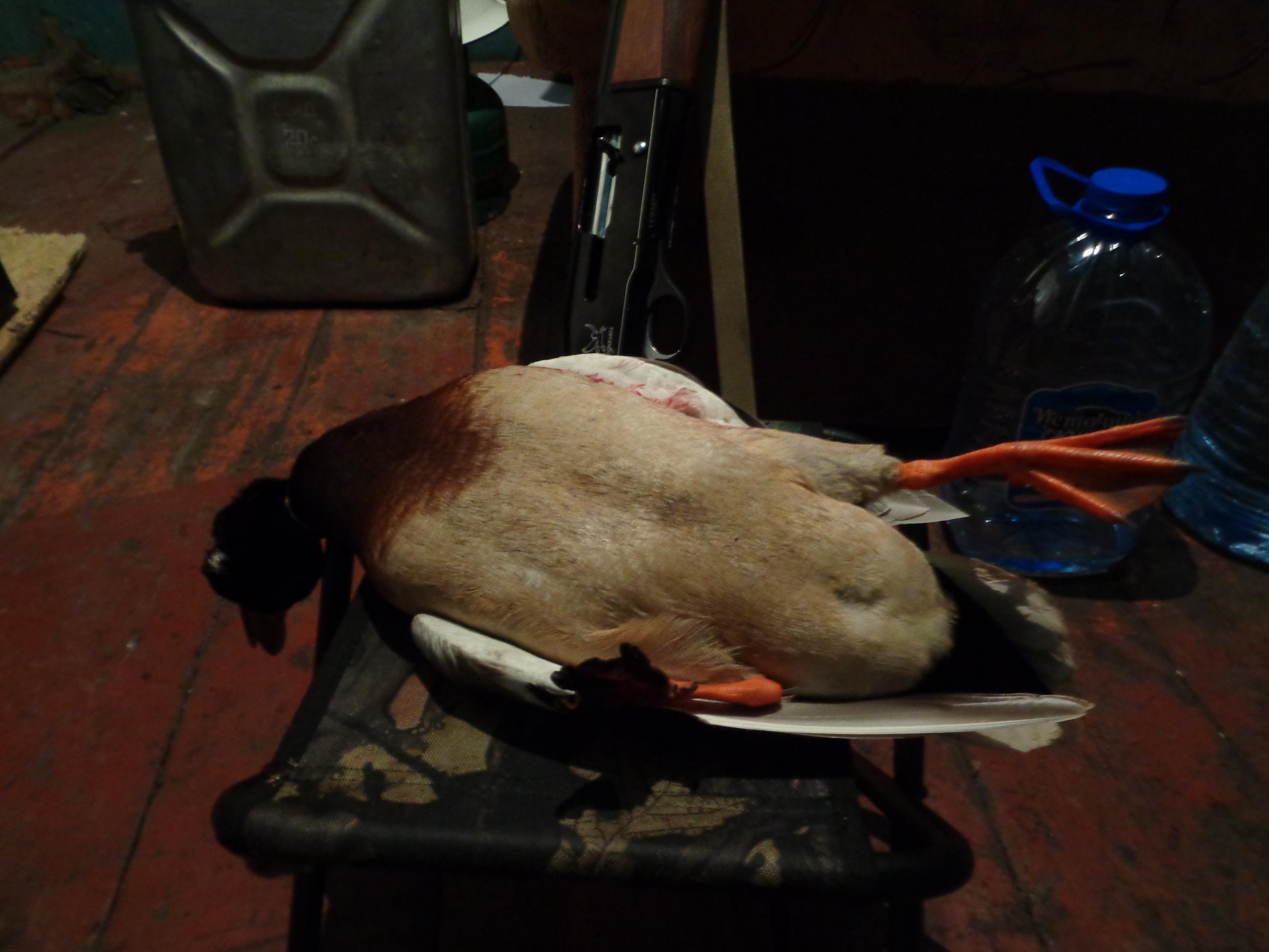 На верчению зорьку пошол один, встав в скрадок товарищ я предварительно расставив несколько чучел на небольшой луже талой воды. Заработал манком, движения уток не наблюдалось. Через некоторое время до моего слуха доносится "трель" селезня крякаша, я ему отвечаю манком ( метрах в 100-150 от лужи протекает ручей, селезень сидит в нем) "пообщавшись" минут десять, услышал как он взлетел и с "трелью" летит на меня, но не вижу на фоне неба, продолжаю манить. И...(нативам-здрасти) селезень прилетел низом, сел на сухую траву в двух -трех метрах от скрадка и при этом продолжает "свирцать". На сухой траве его "четко" видно, стрелять с такого расстояния...не вариант. Резко встаю, вскидываю ружью, селезень взлетает под большим углом и вылетев на едва светлый фон неба я выстрелил. Есть попадание но падает как с перебитым крылом. Выбегаю из скрадка и "голопом" за ним (на мое везение он упал в кусты вербы а не в воду) Вообщем с фонариком на лбу, побегал за ним пару минут меж кустов, взял живым, пришлось резать горло(см фото)