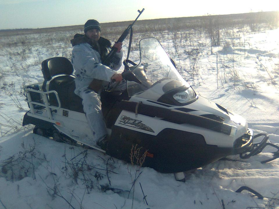 В это время мы поострили глаз, доехали до какой-то довольно приличной беседки возле дороги и приступили острить второй глаз с вновь прибывшими охотниками. Корче глаза мы острили весело, беседуя на различные темы связанные с охотой, периодически отогреваясь, в рядом стоящем, Колькином (из Дмитровска, на фотографии смосинкой) уазике. Из-за холода никто не пьянел, поэтому выпивали часто. К обеду приехали егеря на снегоходе и наконец-то мы стали пробиваться на своих машинах по занесённым снегом полям.